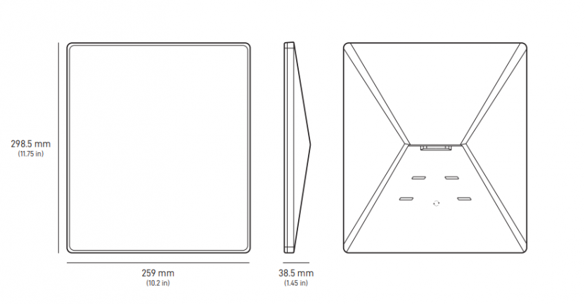 Размеры Starlink Mini 298,5 x 259 x 38,5 мм. Вес — 1,1 кг, или 1,53 кг с комплектом (15 метровый кабель питания и подставка). Класс пылевлагозащиты устройства IP67, допускается кратковременное погружение в воду.
