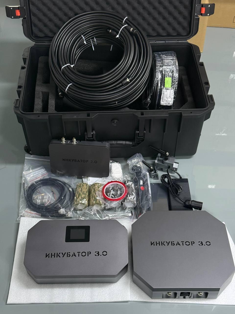 №1. Антенный блок Инкубатор 3.0, кронштейны на штатив и трубу, диагностический блок индикации режимов работы каждого из двух усилителей с кнопкой питания, 50 метров кабеля 220В и портативная аккумуляторная электростанция 299 ватт-час для бесперебойного и защищенного от помех генераторов