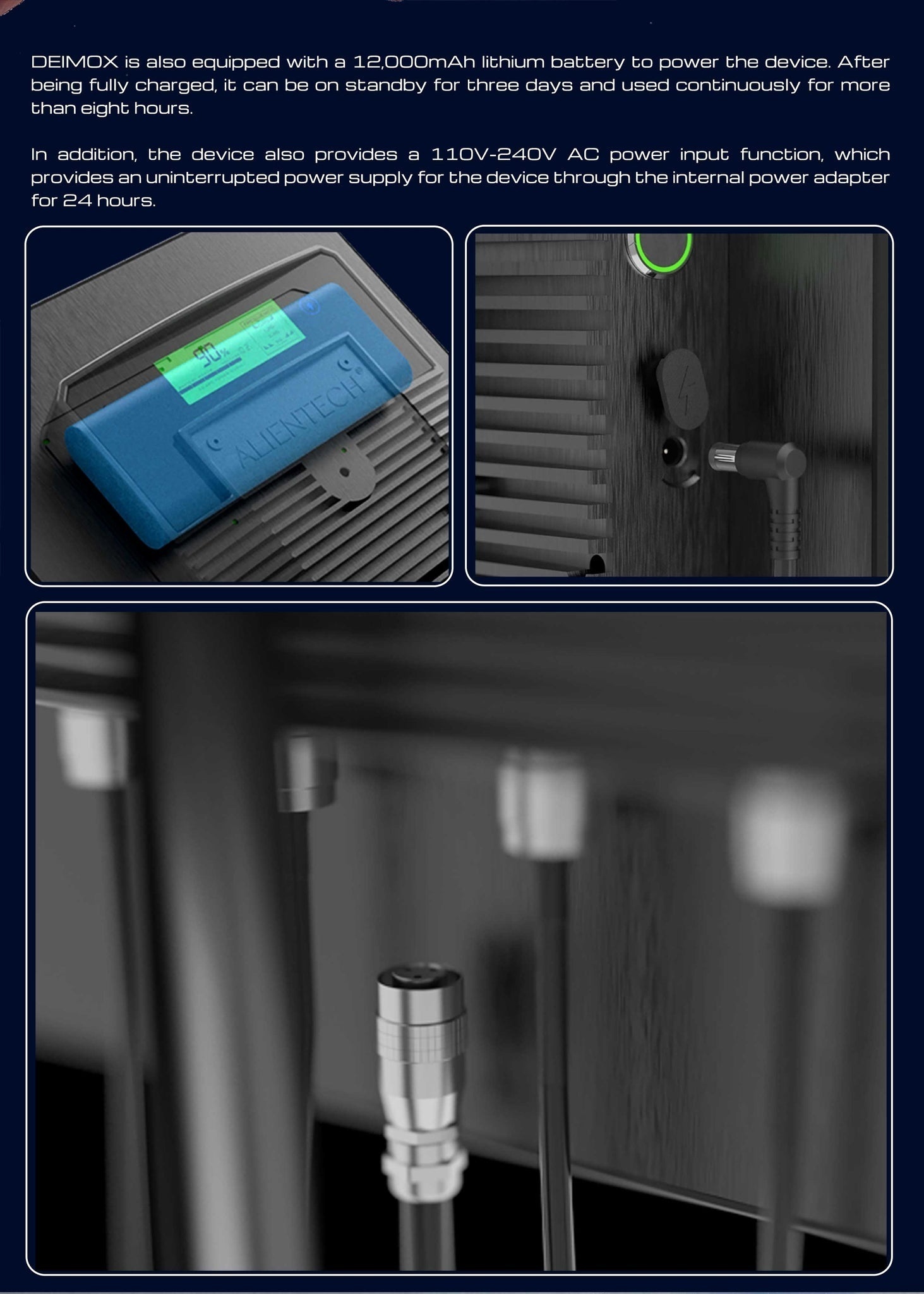 Deimox предназначен для работы на открытом воздухе в диапазоне температур от -40°C до 80°C, устойчив к дождю и экстремальному холоду. Его портативная конструкция облегчает транспортировку и развертывание в разных операционных сценариях. Устройство питается от надежного аккумулятора (DC11.1V/15000mA), дополняемого зарядным устройством с напряжением/током DC13.5V=8A. Для стационарного использования или длительных задач доступен источник питания переменного тока в диапазоне от 100 до 240 В с максимальным потреблением 110 Вт.